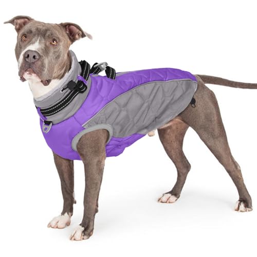 Dog Coats for Large Dogs Winter Waterproof, Warm Dog Cold Weather Coats with D Ring & Adjustable Buckles, Reflective Zippered Fleece Vest Jacket XL Purple