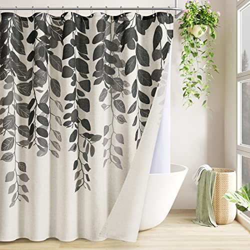 BOODII Black Tan Linen Shower Curtain with Snap in Liner Neutral Shower Curtain Set Country Heavy Duty 200GSM Textured Fabic for Bathroom Vintage Style Beige Grey Bath Decor 72x72