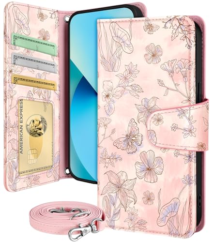 Buleens for iPhone 13 Pro Wallet Case for Women - with Card Holder for iPhone 13 Pro Flip Case Leather Crossbody Cute Aesthetic i Phone 13Pro Case with Strap Kickstand for Girls Girly, PK Line Flower
