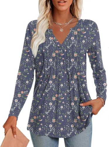 COFNEW Womens Long Sleeve Tunic Tops Plus Size Ladies Fall Fashion Casual Shirt V Neck Pleated Blouse 3XL, Navy Blue Flower
