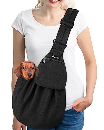 Lukovee Pet Sling, Hand Free Dog Sling Carrier Adjustable Padded Strap Tote Bag, Shoulder Bag with Front Pocket Safety Belt Carrying Small Dog Cat Puppy Machine Washable (Black-WY,S)