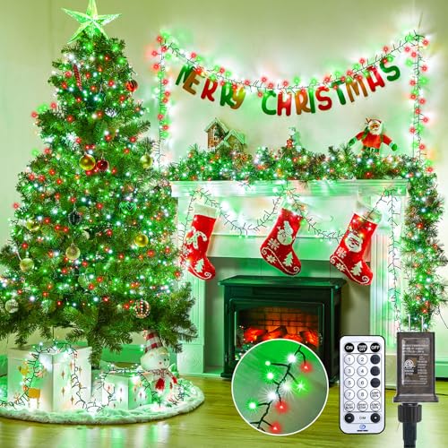 Christmas Tree Firecrackers String Lights - 1000 LED 50 Ft Outdoor Cluster Lights, 12 Modes Timer Remote Waterproof Plug-in Twinkle for Xmas Tree, Red Green & Cool White