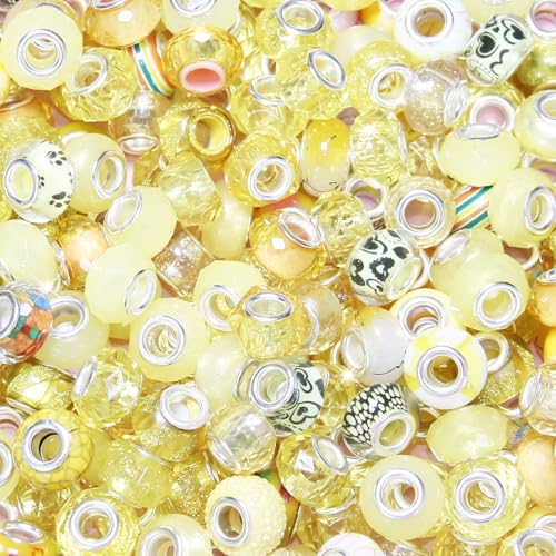 200 Pcs Large Hole Beads Spacer Bead Yellow Assorted European Craft Big Beads Large Hole Lampwork Murano Fairy Wand Garden Bead for DIY Pens Charms Bracelet Necklace Keychain Jewelry Making Supplies