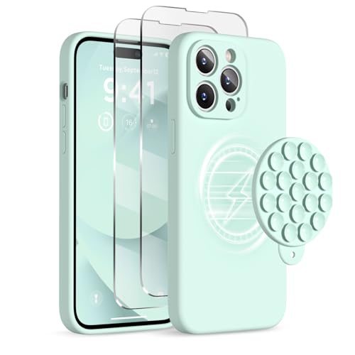 HSAOHD Magnetic for iPhone 14 Pro Max Case, Compatible with MagSafe, [Full Camera Protection][2 Screen Protectors], Suction Cup Phone Mount Silicone Shockproof Protective Phone Case 6.7", Mint Green