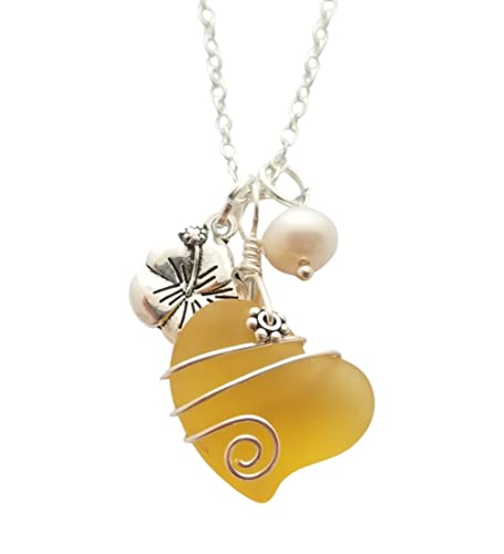 Yinahawaii Handmade Sea Glass Necklace, Wire Heart Necklace, Charm and Pearl Necklace, Sea Glass Jewelry Birthday Gift For Women (Yellow - November)