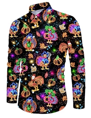 Adovigo Men Turkey Thanksgiving Shirts Neon Long Sleeves Funky Graphic Tacky Button Down Shirts XXL