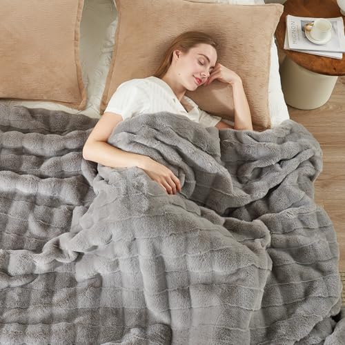 Cozy Bliss Fluffy Faux Fur Blanket Queen Size for Bed, Fuzzy Soft Striped Plush Blanket, Thick Throw for Bedroom Couch Gift, 90x90 Inches Grey