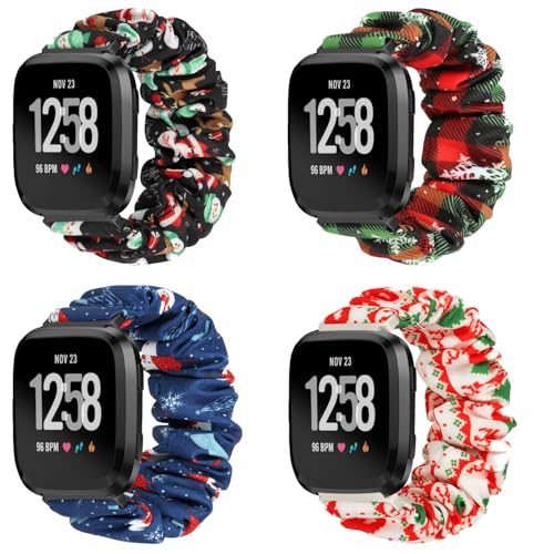 ShuYo Scrunchie Watch Bands for Fitbit Versa/Versa 2 / Versa Lite/Versa SE Women Men,Replacement Soft Nylon Stretchy Wristabnd For Fitbit Versa Smart Watch (Red + Christmas + Snowman + Plaid, 23mm M)