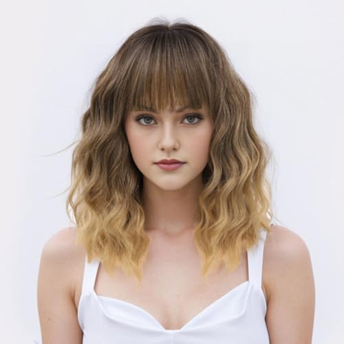 LOSMOEER Ombre Honey Blonde Wig with Bangs Short Wavy Wigs for Women Shoulder Length Curly Bob Wigs Heat Resistant Synthetic Wigs for Halloween Cosplay Daily Party Use