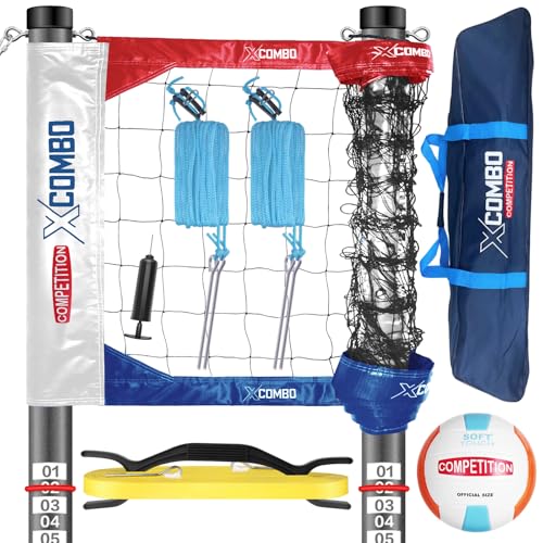 JOLORLY Professional Volleyball Net Set Heavy Duty for Outdoor Backyard Portable with Aluminum Adjustable Height Scoring Poles, Regulation Nets System for Tournament, Grass (Red and Blue)