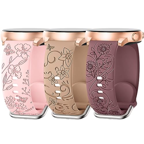 SuperNaNa Floral Design 3 Pack Samsung Galaxy Watch Bands for Women, Elegant Butterfly and Wildflower Engravings, 20mm Width, Quick Release, Soft Silicone