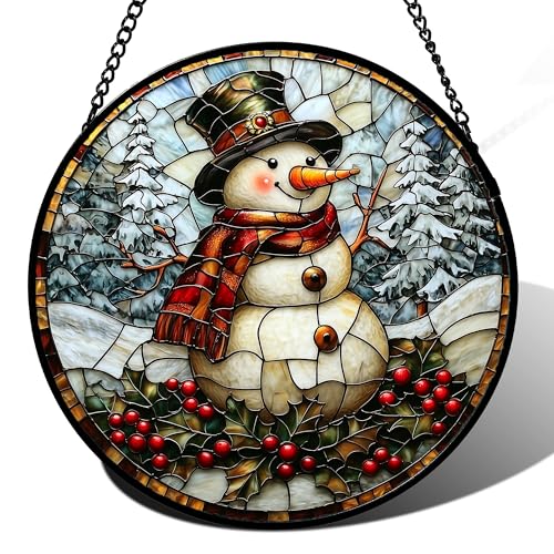 JOSUMALY Stained Glass Window Hanging - Christmas Snowman Suncatcher for Door Terrace Garden Home Decor Winter Forest Snow Sun Catcher Birthday Gifts for Lovers Women Men Dad Mom Nana 6.3 in
