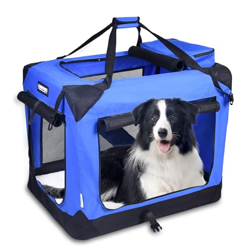 JESPET 36'' Soft Dog Crates Kennel for Pets, 3 Door Soft Sided Folding Travel Pet Carrier with Straps and Fleece Mat for Dogs, Cats, Rabbits, Grey Blue & Beige (36" L x 24" W x 27" H, Blue)