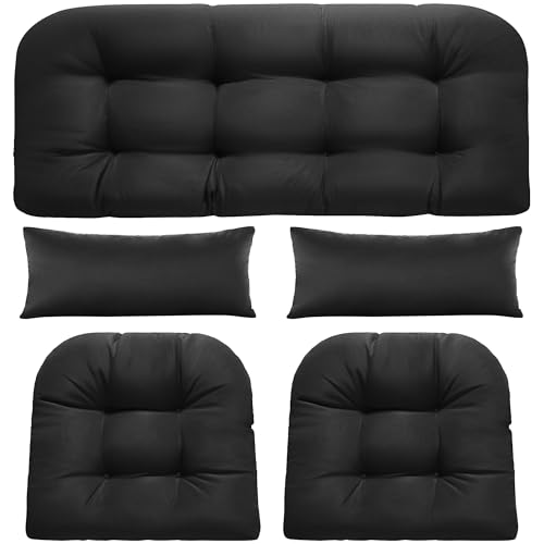 PITCTCHIC Wicker Chair Cushions of 5 Pieces, Waterproof Outdoor Loveseat Cushion for Wicker Furniture, 1 Love Seat Cushion, 2 U-Shape and 2 Lumbar Pillows for Patio Furniture (Black)