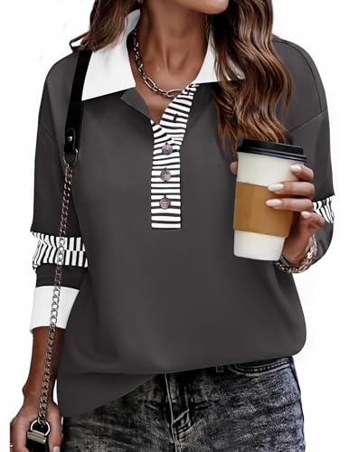 Zeagoo Oversized Sweatshirt for Women V Neck Pullover Henley Fall Long Sleeve Loose Fit Tops Color Block Shirts Ribbed Trim Blouses Fashion Business Work 2025 Dark Gray XL