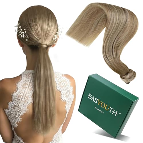 Easyouth Ponytail Hair Extensions Ombre Human Hair Wrap Around Ponytail Balayage Dark Brown to Light Brown Mix Blonde Real Hair Ponytail Extension Easy to Apply and Remove 18 Inch 80g