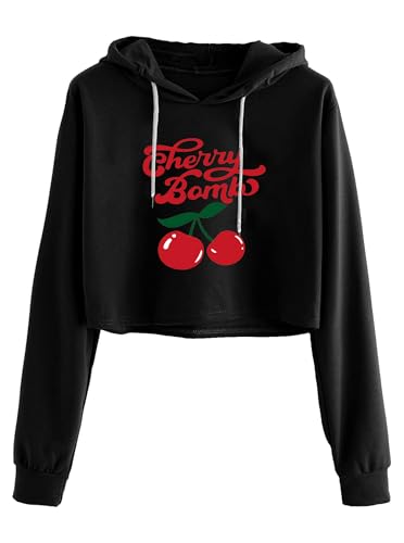 Remidoo Women's Casual Graphic Drawstring Cropped Hoodie Long Sleeve Pullover Crop Top Sweatshirt Black Small
