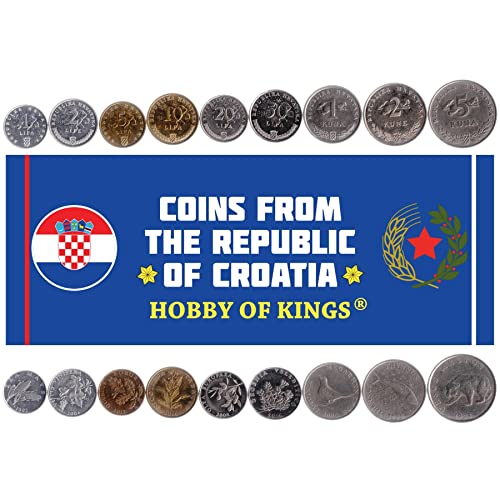 9 Coins from Croatia | Croatian Coin Set Collection 1 2 5 10 20 50 Lipa 1 2 5 Kuna | Circulated 1994 - 2022 | Marten | Brown Bear | Nightingale | Tuna | Corn | Olive | Velebit Degenia | Red Oak | Linden | Grapes