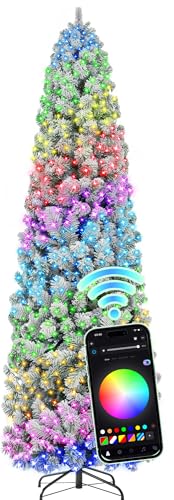 HOLLO STAR 7.5 ft Flocked Prelit Christmas Tree with 348 LED Lights, App Control, Skinny Artificial Pencil Christmas Tree, Multi-Color RGBW Lights, 960 Branch Tips, for Small Space, Home, Party