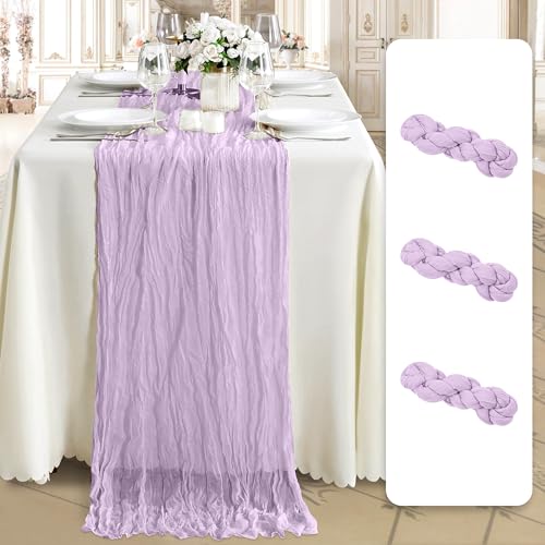 Cheesecloth Table Runner 3 Pack – 35x120 Inch (10ft) Boho Rustic Gauze Cloth Runners – Crinkle Polyester Table Decor for Wedding, Baby Shower, Bridal Shower, Birthday Party and More (Lilac Purple)