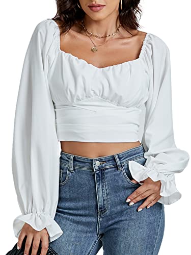 Rooscier Women's Ruched Wrap Square Neck Flounce Long Sleeve Self Tie Crop Top Blouse White X-Large