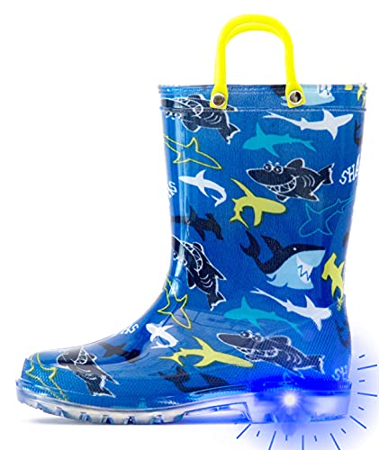 Outee Toddler Boys Rain Boots Little Kids Baby Light Up Printed Waterproof Mud Shoes Blue Shark Lightweight Rubber Adorable with Easy-On Handles Non Slip (Size 8,BLue)