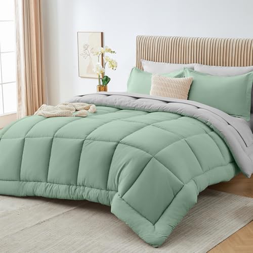 Sasttie Queen Comforter Set, 7 Pieces Bed in a Bag Queen, Complete Bedding Set Includes Comforter, Flat Sheet, Fitted Sheet, Pillowcases and Pillow Shams, Sage & Light Grey