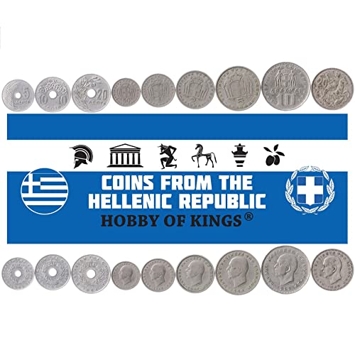 9 Coins from Greece | Greek Coin Set Collection 5 10 20 50 Lepta 1 2 5 10 20 Drachmai | Circulated 1954-1965 | Paul I | Selene