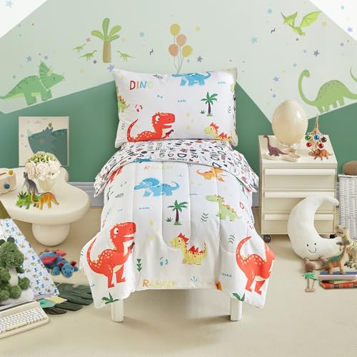 Dinosaur Toddler Bedding Set for Boys Girls White 4 Pieces Toddler Bed Set - Ultra Soft Cartoon Cute Orange Dinos - Comforter Set Fitted Sheet Flat Sheet Pillowcase UOZZIBEDDING SYUTBS-21-T01