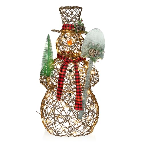 Alpine Corporation 47" Christmas Rattan Snowman Outdoor Statues with Shovel, Scarf, and LED Lights, Holiday Decor