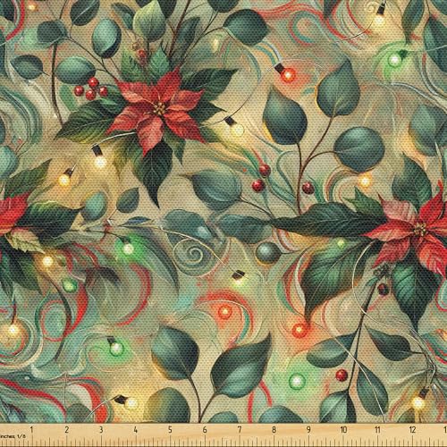 Ambesonne Christmas Fabric by The Yard, Leafy Scene Fantasy Swirls with Blooming Winter Floral Xmas Colorful, Decorative Fabric for Upholstery and Home Accents, 1 Yard, Pale Green Dark Coral