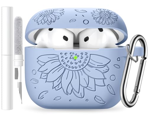 IMIVIO Sunflower Engraved Case for Apple Airpods 4th Generation Cover(2024), Silicone Case with Cleaner Kit & Keychain Compatible with Airpods 4 for Women,Men, Front LED Visible, Sky Blue