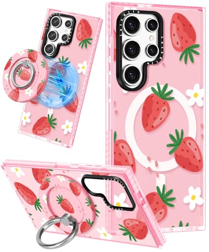 Lotadilo Cute Case for Samsung Galaxy S22 Ultra for Women Girls - Funny Design Compatible with Magsafe Magnetic Ring Holder Kickstand Art Strawberry Flower Fashion Pattern TPU Phone Covers