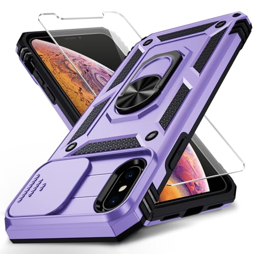 Vinve for iPhone X Case/iPhone Xs Case, Slide Lens Cover, HD Screen Protector, Military Grade Drop Protection, Magnetic Rotated Ring Holder Kickstand Protective Phone Case (Lavender)