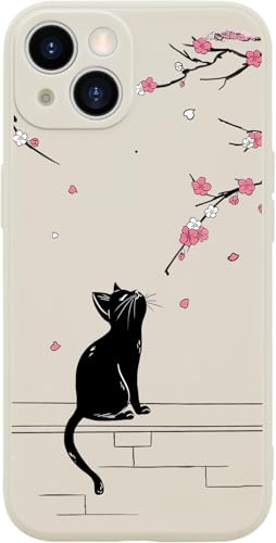 Houdqklee Cartoon Black Cat Case for iPhone 16, Cute Kawaii Girly Cherry Blossom Phone Case Cover Liquid Silicone Soft Gel Rubber Phone Cover with Microfiber Lining for iPhone 16