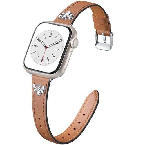 Adorve Slim Leather Bands Compatible with Apple Watch Bands 40mm 41mm 38mm 42mm Women, Top Grain Genuine Leather Strap with Decorative Charms, Thin Wristband for iWatch Series SE 10 9 8 7 6 5 4 3 2 1