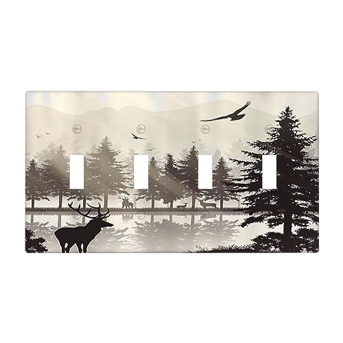 Misty Forest Deer Mountain Tree Black Woodland Lake Nature 4 Gang Light Switch Plate Cover Quad Toggle Wall Plate Electrical Faceplate Decorative Switchplate for Bathroom Kitchen Bedroom Decor