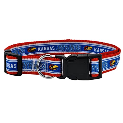 Pets First Collegiate PET Collar New Version Kansas Jayhawks Dog Collar, Size Small. Best Sports Team Color for Dogs & Cats. A Shiny & Colorful Dog & Cat Collar Licensed by The NCAA
