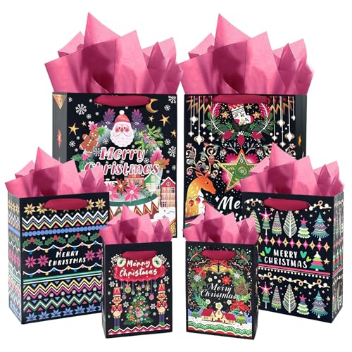 qiqee Christmas Paper Gift Bags with Tissue Paper Handles Assorted Sizes 10PCS Merry Christmas Bags(2pcs Large 13", 4pcs Medium 9", 4pcs Small 6",30pcs Tissue Paper)