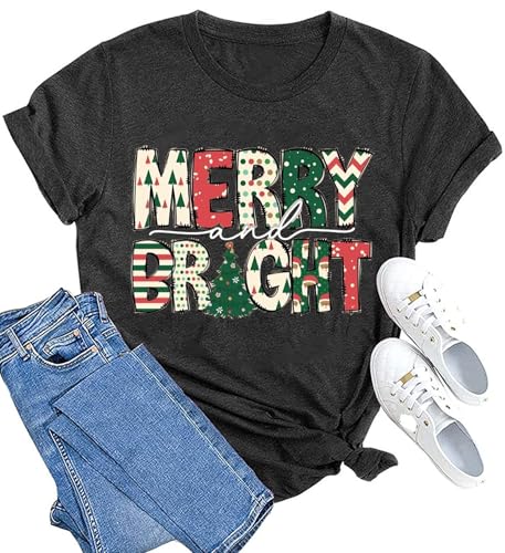 hcihgzr Merry Christmas Shirts for Women Funny Xmas Merry and Bright Graphic T-Shirt Christmas Casual Holiday Short Sleeve Tee Tops(L,7 Dark Grey)