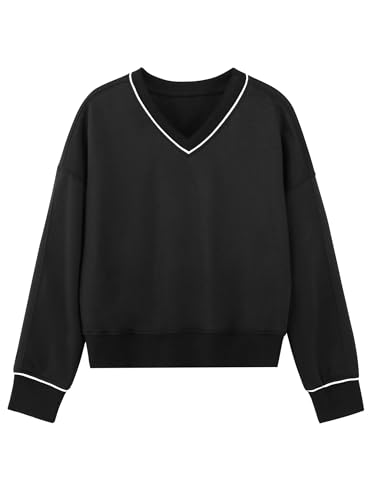 Avanova Women V Neck Plain Sweatshirt Drop Shoulder Fall Casual Pullover Top Black White Medium
