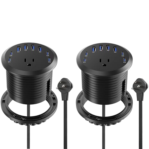 Jgstkcity 65W USB-C Hidden Desktop Power Grommet: 1 AC Outlet,8 USB Charging Ports,3'' Hole Flush Mount Pop-Up Power for Conference Tables & Nightstands (Black, 6 FT - 2PCS)