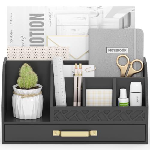 Wisuce Essentials Bamboo Desk Organizer with Drawers, Mail Organizer Countertop Wood Desk Drawer Tabletop Storage Organization Pen Holder Letter Sorter Makeup Organizer for School Home Office (Black)