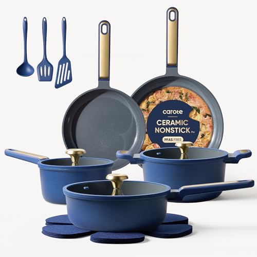 CAROTE Ceramic Cookwar Set, Pots and Pan Set Non Stick 16 Piece, Cookware Set Kitchen Cooking Set Non Toxic, PFAS PTFE Free, Blue