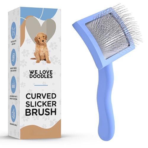 Slicker Brush for Dogs, Dog Grooming Supplies - Best Doodle & Poodle Brush for Long Haired Dogs - Goldendoodle Long Pin Detangler For Dematting (Small Curved)