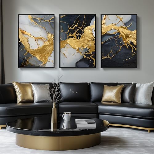 Framed Black and White Gold Abstract Wall Art for Living Room, 3 Piece Large Canvas Paintings Prints Artwork for Walls, Modern Wall Art Pictures for Entryway Hallway Office Wall Decor Total 30x60 Inch