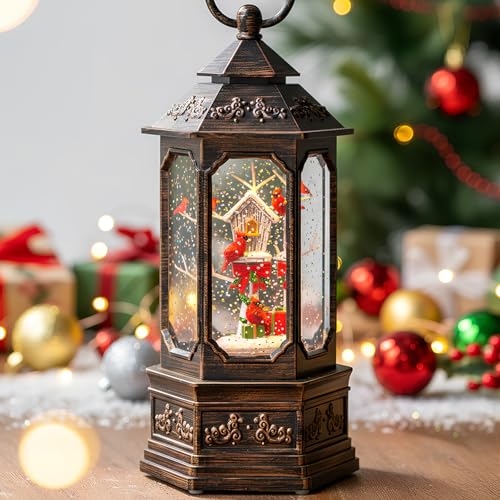 Christmas Snow Globe Lantern Water Glittering 11.6'' Cardinal & Birdhouse with Music & Timer, USB Lined/Battery Operated Lighted Lantern for Christmas Festival Decoration Gifts