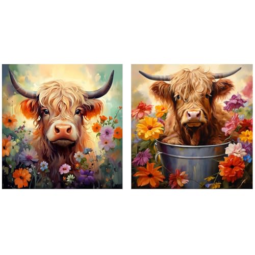 OFRKE 2-Piece Highland Cattle Diamond Painting Kits for Adults, Round Full Drill 5D DIY Diamond Art Kits for Home Wall Decor 12"x12"