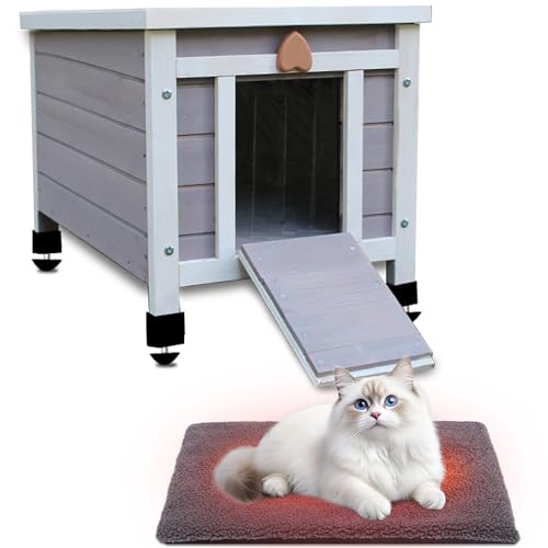 Rockever Outdoor Cat House,Outdoor cat Houses for Feral Cats Weatherproof Rabbit Hutch Small, Wooden Small Pet House and Habitats-Grey with Mat