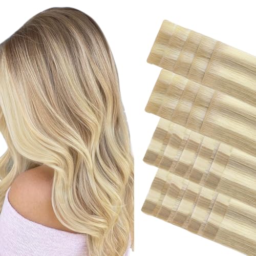 GOO GOO Invisi Edge Tape in Hair Extensions Human Hair, 18A/613A Dark Blonde Highlighted Bleach Blonde 10pcs injected with 10pcs classical tape ins, 14inch 50g, Virgin Remy Hair, Natural Look